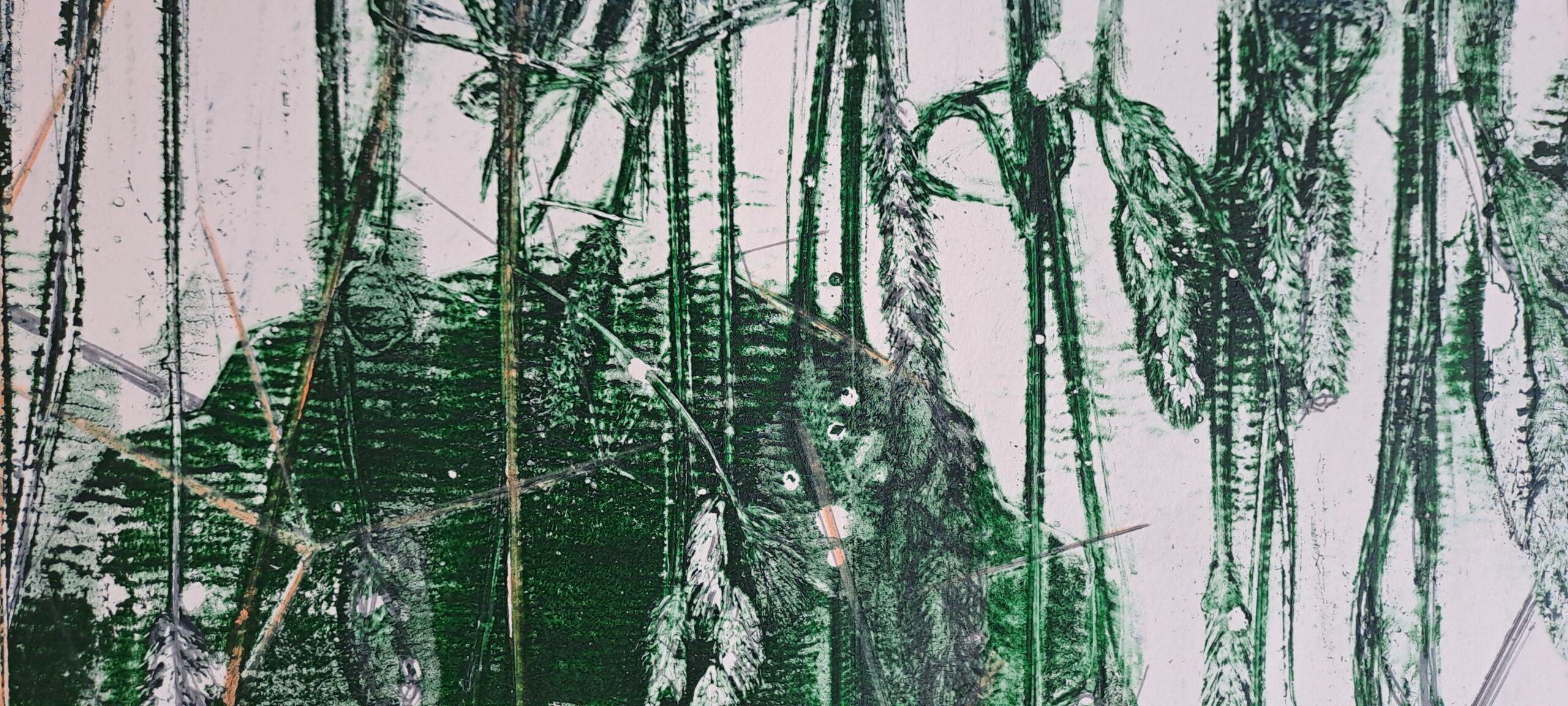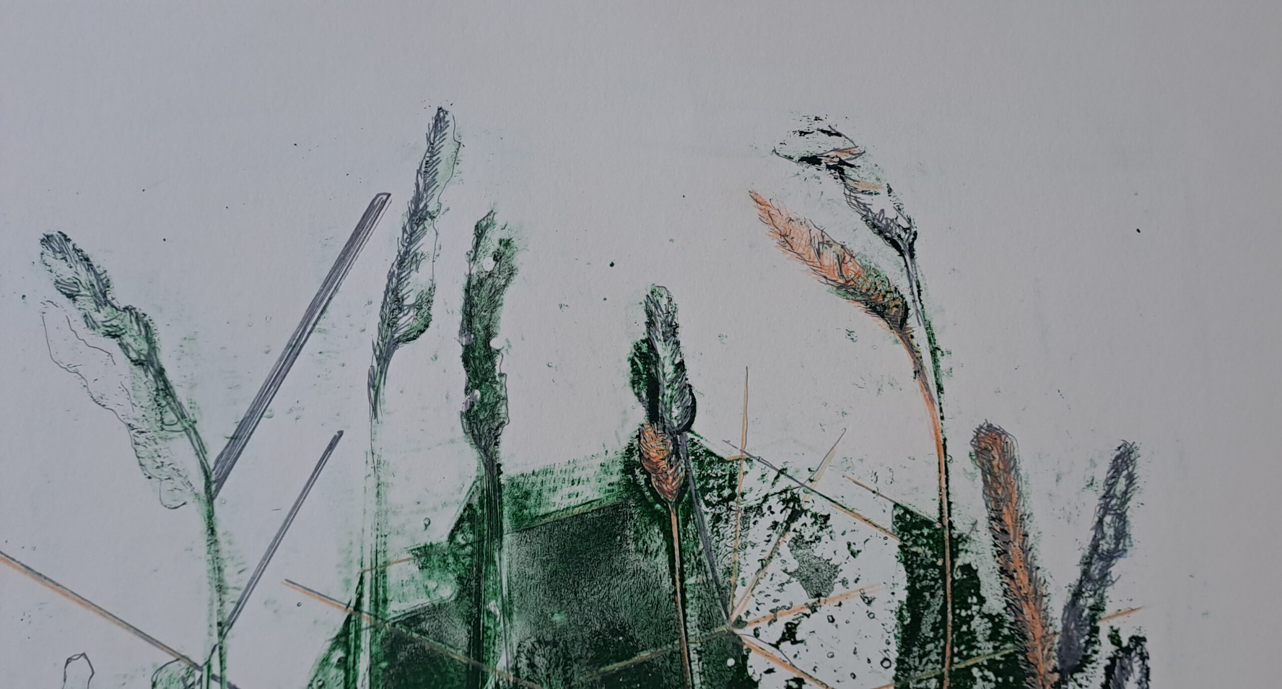 The artwork depicts an abstract representation of a grassy landscape. It consists of a multi-layered composition of partially transparent structures that blend seamlessly into one another through the printing technique. The color palette is restrained—dominant are various shades of green, as well as blues in the lower part of the image, creating a natural atmosphere, yet appearing more like an emotional landscape than a realistic depiction. Characteristic of the work are the deliberately placed colored pencil drawings: fine lines embedded sporadically within the printed image. These drawings appear as interventions or traces, with orange or light gray, they overlay the organic print and vaguely recall schematic sketches, technical markings, or graphic symbols. They suggest a human order or intervention in the otherwise free, natural motif.